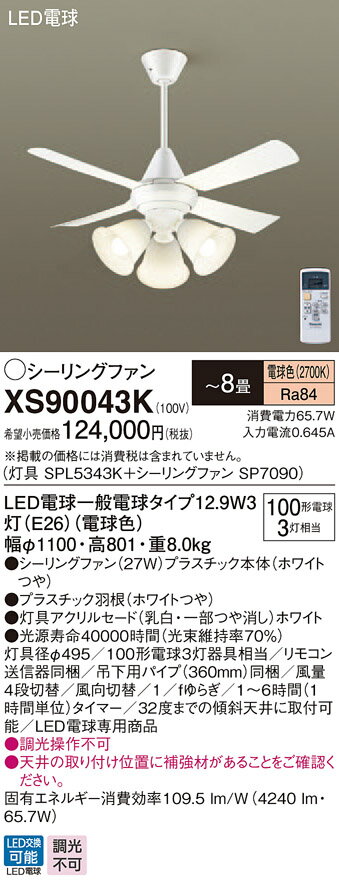 商 品 詳 細商品名インテリア 屋内 照明メーカー名パナソニック Panasonicメーカー器具名称シーリングファン(天井扇)仕様光源◆LED電球一般電球タイプ12.9W3灯(E26)(電球色)◆色温度:2700 K◆光源寿命40000時間(光束維持率70%)寸法・質量◆幅:φ1100 mm◆高:801 mm◆質量:8 kg仕様・注意事項LED照明の安心品質◆器具光束:4240 lm◆電圧:100 V◆消費電力:65.7 W◆消費効率:109.5 lm/W◆畳数:〜8畳◆Ra84◆灯具径φ495◆100形電球3灯器具相当◆リモコン送信器同梱◆吊下用パイプ(360mm)同梱◆風量4段切替◆風向切替◆1/fゆらぎ◆1〜6時間(1時間単位)タイマー◆32度までの傾斜天井に取付可能◆LED電球専用商品◆入力電流(100V時):0.645 A◆調光操作不可◆天井の取り付け位置に補強材があることをご確認ください。